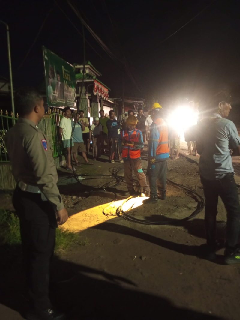 Bripka Yoga tiba di lokasi kejadian, pemeriksaan rumah yang tertimpa tiang listrik dan mengecek rumah warga yang listriknya padam, memastikan situasi aman dan kondusif.